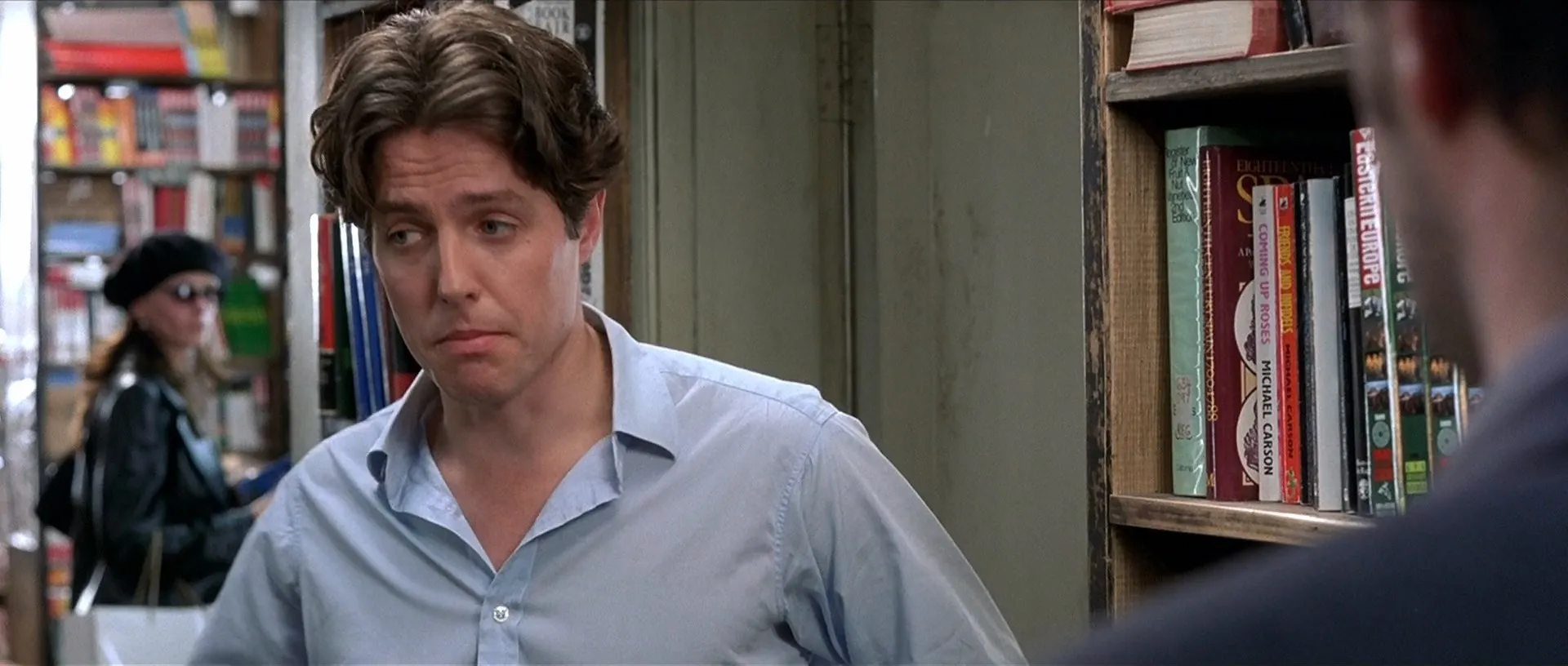 Cast: Julia Roberts as Anna Scott, Hugh Grant as William Thacker, Gina McKee as Bella, Tim McInnerny as Max, Rhys Ifans as Spike, Emma Chambers as Honey, Hugh Bonneville as Bernie, Richard McCabe as Tony, James Dreyfus as Martin, Dylan Moran as Rufus the Thief, Roger Frost as Annoying Customer, Henry Goodman as Ritz Concierge, Julian Rhind-Tutt as 'Time Out' Journalist, Lorelei King as Anna's Publicist, John Shrapnel as PR Chief, Emily Mortimer as Perfect Girl, Dorian Lough as Loud Man in Restaurant, Sanjeev Bhaskar as Loud Man in Restaurant, Paul Chahidi as Loud Man in Restaurant, Matthew Whittle as Loud Man in Restaurant, Mischa Barton as 12-year-old Actress, Clarke Peters as 'Helix' Lead Actor, Ann Beach as William's Mother, Samuel West as Anna's Co-Star, Tony Armatrading as Security Man, Andy de la Tour as Journalist, Rupert Procter as Journalist, Maureen Hibbert as Journalist, David Sternberg as Journalist, Arturo Venegas as Foreign Actor, Phillip Manikum as Harry the Sound Man, Patrick Barlow as Savoy Concierge, Yolanda Vazquez as Interpreter, Melissa Wilson as Tessa, Emma Bernard as Keziah, September Buckley as Third Assistant Director, Dennis Matsuki as Japanese Businessman, Alec Baldwin as Jeff King (uncredited), Simon Callow as Simon Callow (uncredited), Omid Djalili as Coffee Shop Cashier (uncredited), Matthew Modine as Actor (uncredited), Taylor Murphy as Journalist (uncredited)
